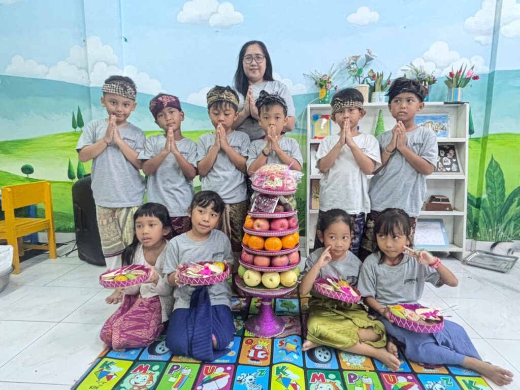 Anak-anak yang beragama Hindu mengenakan busana adat madya, sementara siswa non-Hindu tetap mengikuti kegiatan bersama di kelas. Keterlibatan seluruh siswa menjadi bagian dari pembelajaran tentang kebersamaan, sekaligus menumbuhkan sikap saling menghargai perbedaan.